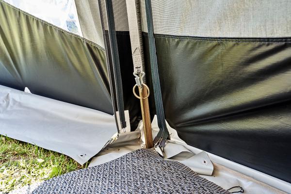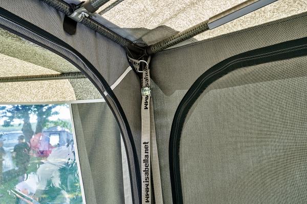 Die Isabella Sturmsicherung sorgt dafür, dass dein Vorzelt bei starkem Wind besonders stabil steht und verhindert den Verschleiß des Zeltgewebes. Dabei wird dieser innen im Vorzelt montiert und sorgt so dafür, dass sich das Gestänge nicht heben kann. Wir empfehlen min. 2 Stück jeweils an den Eckpfosten und ggf. eine 3 in der Mitte wenn du starken Wind erwartest bzw. gerne an windigere Orte fährst. Vermeide es, den Sturmgurt zu fest anzuziehen, da das Gerüst sonst einsinken kann. Der Sturmgurt sollte nur bei starkem Wind als Halt dienen.