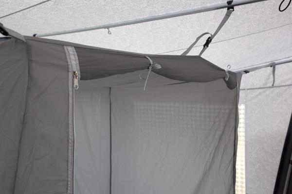 Beim Zusammenlegen immer darauf achten, dass niemals zwei Fensterfolien aufeinander liegen. Bitte immer die Gardinen oder andere Textilien dazwischen legen. Bevor das Zelt eingelagert wird, sollte es komplett trocken sein! Die Lagerung sollte zwar trocken jedoch nicht zu warm erfolgen.