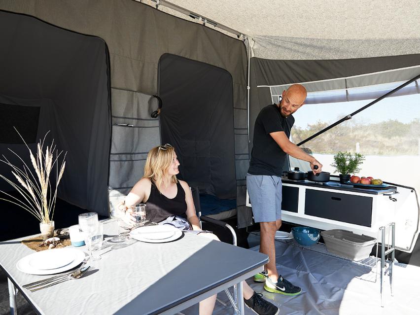 Som standard er der ikke noget køkken på bagklappen af Camp-let North, men du har mulighed for at tilkøbe en køkkenpakke. Alle køkkenpakker kan svinges rundt og ud i opholdsrummet, så du kan lave mad inde i teltet.