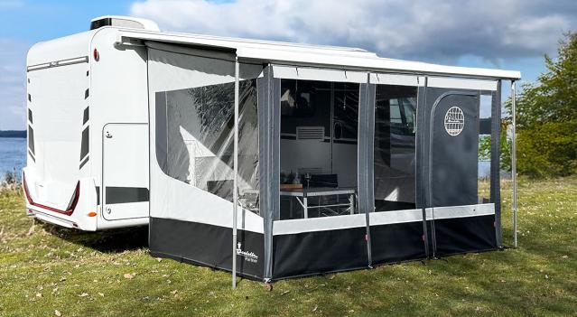 Buddy er et slidstærkt og stilfuldt markisetelt designet til at montere på campingvognens/køretøjets markise for både at skabe læ og skygge uden for campingvognen/køretøjet.
