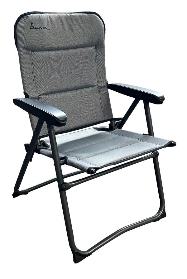 Sædet er polstret med 1,5 cm skum og betrukket med slidstærkt polyester med PVC-coating, som giver en god siddekomfort og er nem at holde ren. Det pulverlakerede aluminiumsstel (Ø25 mm) gør stolen stabil, men samtidig nem at håndtere og pakke væk. Nanna stolen fås i farven Light Grey, som passer ind i de fleste campingmiljøer med sit enkle og moderne udtryk.