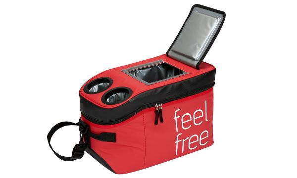 Le sac isotherme est disponible en un beau rouge avec le logo Isabella sur le dessus et « feel free » sur l’un des côtés.