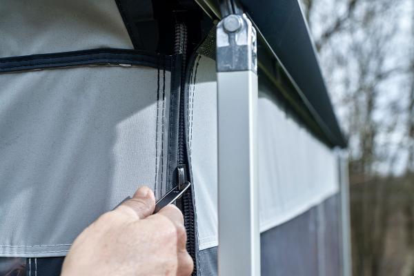 Van Side è disponibile in due versioni da montare sul lato destro (con la porta) o sul lato sinistro del tendalino srotolabile. Il lato si adatta a tendalini srotolabili con una profondità di 200 cm e una larghezza minima di 260 cm.