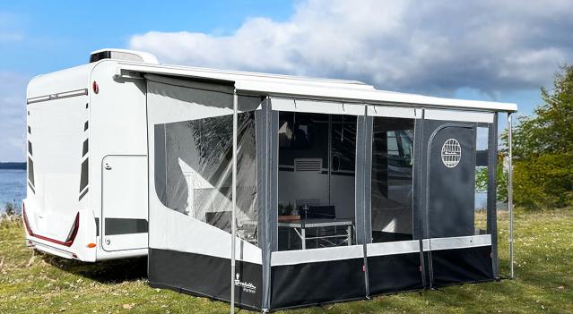 Crea un'accogliente area esterna davanti al tuo caravan, camper o furgone con Wind Front, che si fissa facilmente alla veranda per offrire maggiore riparo e comfort.
