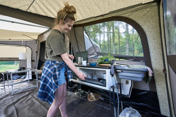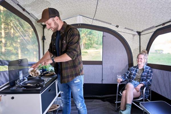 Heb je een keuken in je Camp-let? Dan komt deze zijtent goed van pas. Hij werkt perfect als overdekte keukenruimte zodat je maaltijden kunt bereiden zonder je zorgen te maken over het weer. De zijtent kan ook worden gebruikt als extra slaapruimte, eethoek of extra opbergruimte.