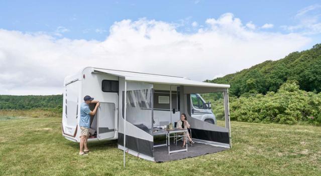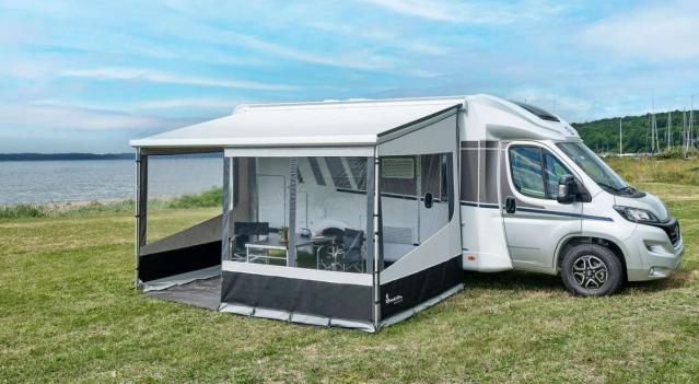 Creëer een gezellige buitenruimte voor je caravan of kampeerauto met Wind Front, dat gemakkelijk aan je uitrolbare voortent kan worden bevestigd voor extra beschutting en comfort.