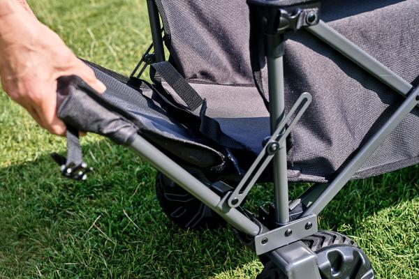 Beach Trolley gør det nemt at transportere campingudstyr, strandstole, kølebokse og indkøb – især når du gerne vil slippe for at gå flere gange. Med sin store kapacitet, robuste konstruktion og solide hjul er den et perfekt hjælpemiddel, når du skal have grejet med på tur. Det justerbare håndtag giver god kontrol, og gør vognen er let at trække – selv når den er fuldt lastet. De store hjul med mønster sikrer, at trækvognen nemt klarer ujævnt terræn som græs, grus og sand uden problemer.