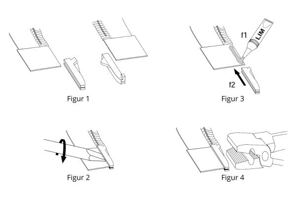 - Påfør kontaktlim der, hvor det nye endestop skal sidde (f1), og skub det nye på plads (f2) (se figur 3).