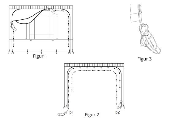 - Træk skyderen helt hen til det modsatte endestop (b1) og fortsæt forbi endestoppet for at fjerne den. Sæt den nye skyder på lynlåsen og træk den tilbage til udgangspositionen (b2) (se figur 2).