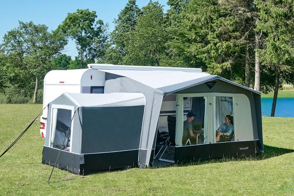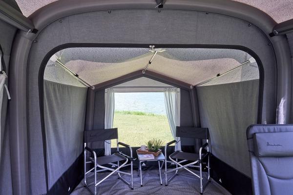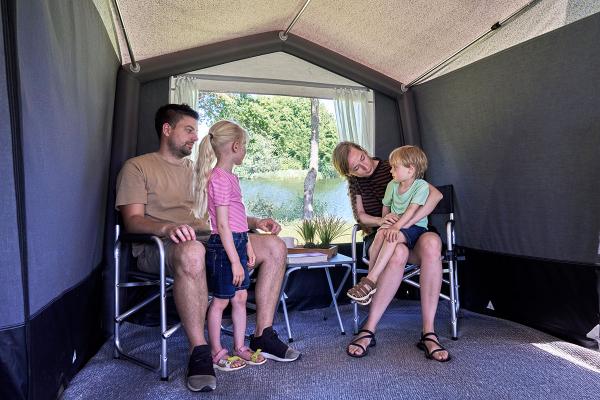 Alle luftkanaler er forbundet i et samlet system, så du kun skal pumpe op fra én ventil. Luften fordeler sig automatisk i hele annekset. Begge ventiler har en praktisk gummimembran, som forhindrer luften i at sive ud, når du fjerner pumpen. Der er to ventiler i alt, som alle kan åbnes, når luften hurtigt og effektivt skal lukkes ud igen. Alle ventiler er diskret placeret bag en beskyttelseslomme, der skærmer mod regn og skidt.