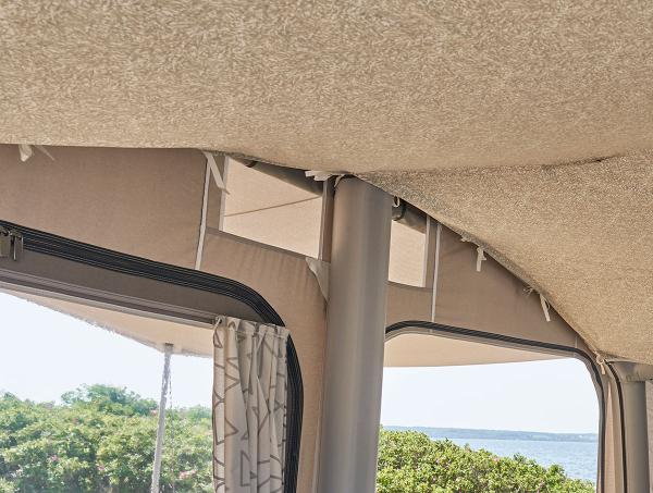 Støvsug eller børst teltet af, når det er tørt. Efterfølgende aftørres med en fugtig klud.