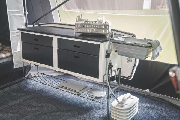 Need a spacious and functional kitchen for your Camp-let? The Basic+ kitchen is designed for you to easily prepare delicious meals even when you're on the move. With a large and sturdy worktop, you will have plenty of space to chop, slice and prepare your food. The practical sink easily folds away when not in use, making it easy to optimise space.