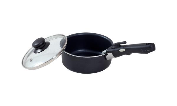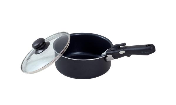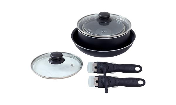 The pot and pan set consist of three pots, three glass lids, one pan and two removable handles. It is easily stackable and takes up minimal space when not in use. The bottoms of the pots and pan distribute heat evenly for the best cooking results with low energy consumption. The glass lids have steam vents and heat-resistant plastic handles for safe operation. The set can be used on induction, gas and ceramic hobs.