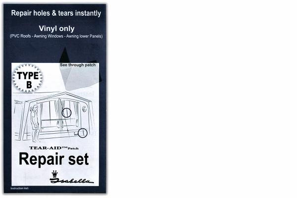 Isabella repair kit for awnings. The patches are transparent. Type B is for PVC, developed especially for repairing windows, PVC roofs and lower awning panels. Also available in Type A for Acrylic.