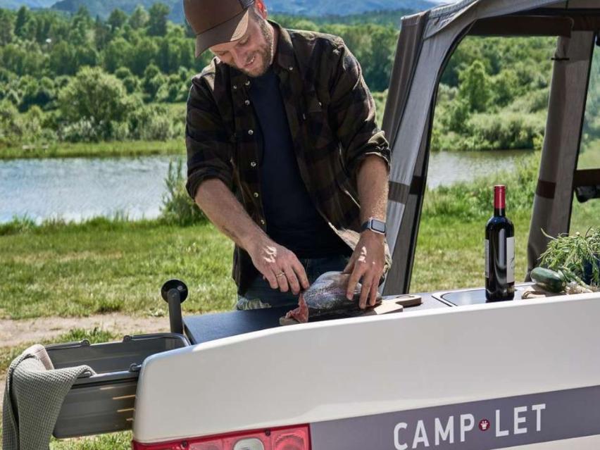 As standard, there is no kitchen module on the tailgate of the Camp-let Earth, but you have the option to purchase a kitchen package. All kitchen packages can be swivelled around and out of the tent so you can cook outdoors. For your outdoor cooking, you can purchase an Earth Side Tent to shelter you from the rain and shade you from the sun.