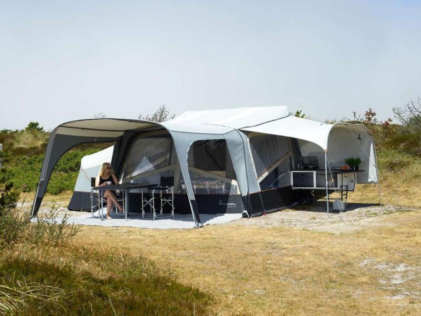 Camp-let Passion gives you the freedom to experience nature without compromising on comfort. With its modern and user-friendly design, the Camp-let Passion is the ideal trailer tent for those who love nature and outdoor activities. This Camp-let offers 18 m2 holiday accommodation with room for both relaxation and adventure. Weighing from 270 kg, it is ideal for smaller cars and electric vehicles. With endless customisation options, you can create your very own Camp-let Passion, whether you want extra sleeping cabins, a spacious kitchen sun canopy, or simply more living space.