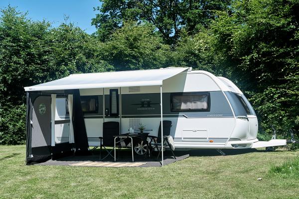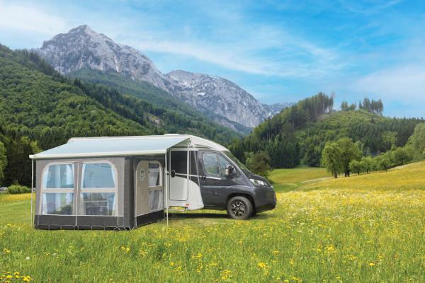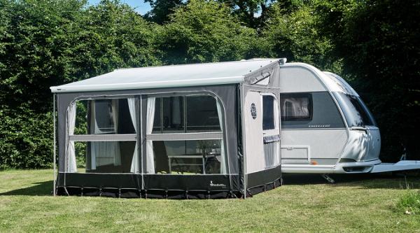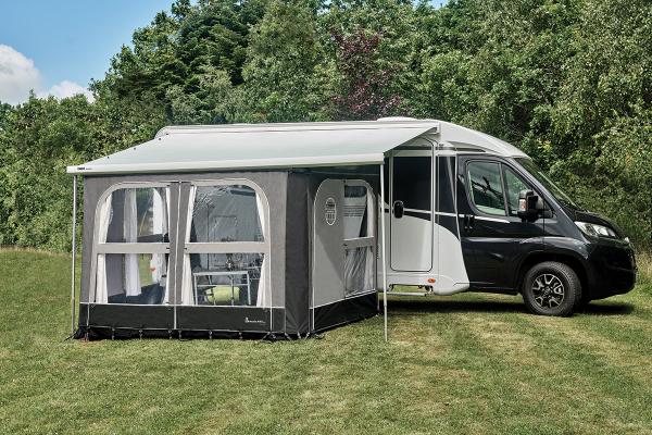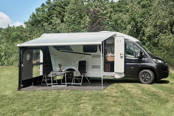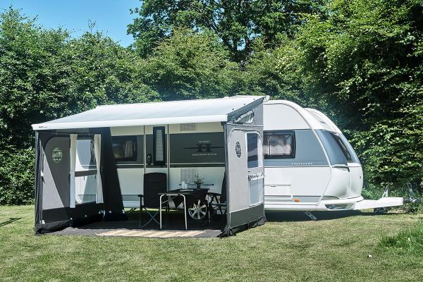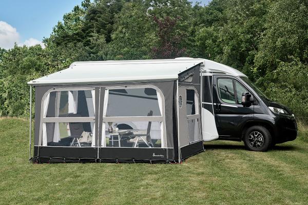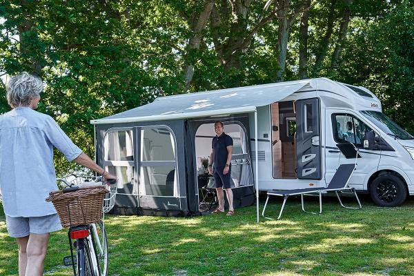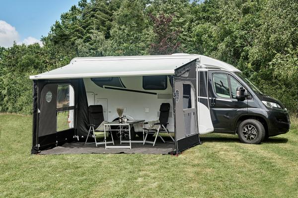 Fönstren i Buddy-frontpanelen kan öppnas med blixtlås. Den medföljande verandastången gör att du kan skapa en veranda.