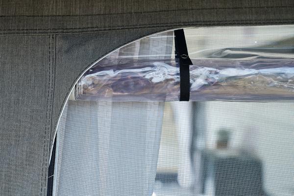 Baldakin runt hela tältet, transparent parti i mitten av taket, myggnät i båda gavlarna, hörndörr i vänster front, två dörrmöjligheter.
