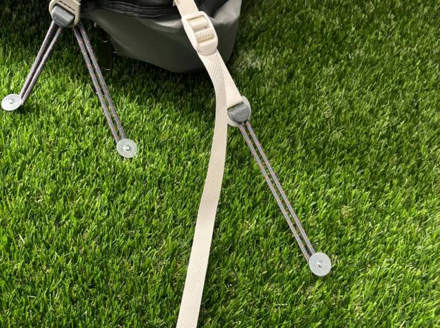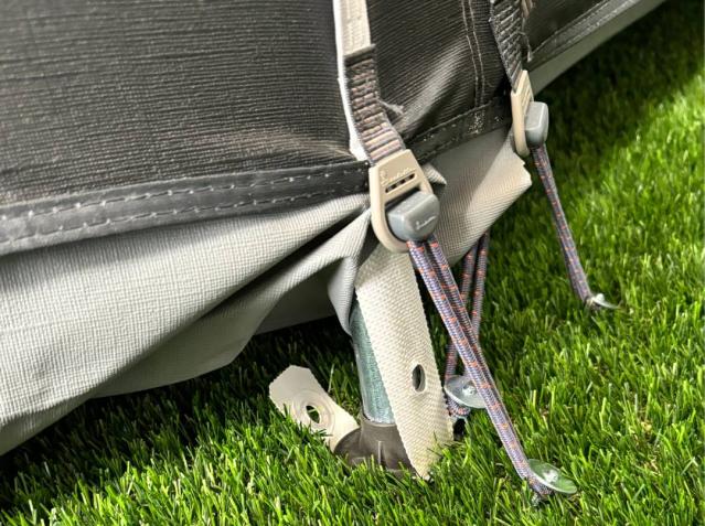The regulator straps on the front legs help tighten your awning and regulate the height of the awning on uneven terrain. The foot of a front leg is equipped with a spike and two points to lock the foot strap in place, ensuring your awning is properly tensioned.
