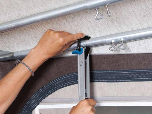 The FixOn screwless caravan bracket ensures that you can tension the roof pole without drilling holes in your caravan, preventing moisture and water damage in the caravan. The bracket is attached to a FixOn profile that is an integral part of the awning, allowing you to position and move the roof pole as needed.