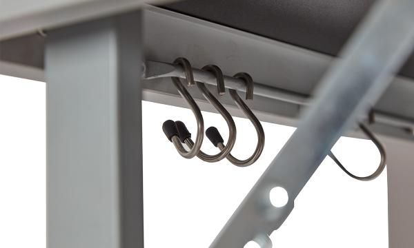 The kitchen is equipped with a high worktop with plenty of room for cooking, and a smaller table for the gas stove. Below the worktop, there are spacious shelves where you can store ingredients and cookware. The kitchen is practical and easy to keep clean. Side table for your stove with windshield, adjustable legs, shelves for pots and other equipment. Foldable lid, hooks for utensils and shelf for spices. Storage bag included.