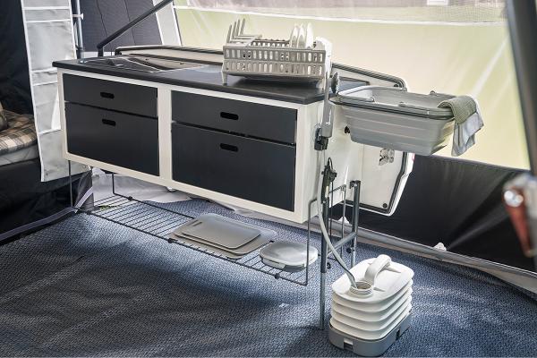 Need a spacious and functional kitchen for your Camp-let? The Kitchen Deluxe is designed for you to easily prepare delicious meals even when you're on the move. With a large and sturdy worktop, you will have plenty of space to chop, slice and prepare your food. The practical sink can easily be folded away when not in use, making it easy to optimise space.